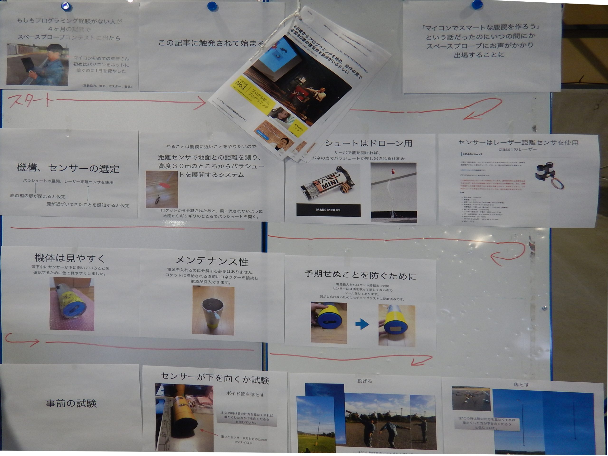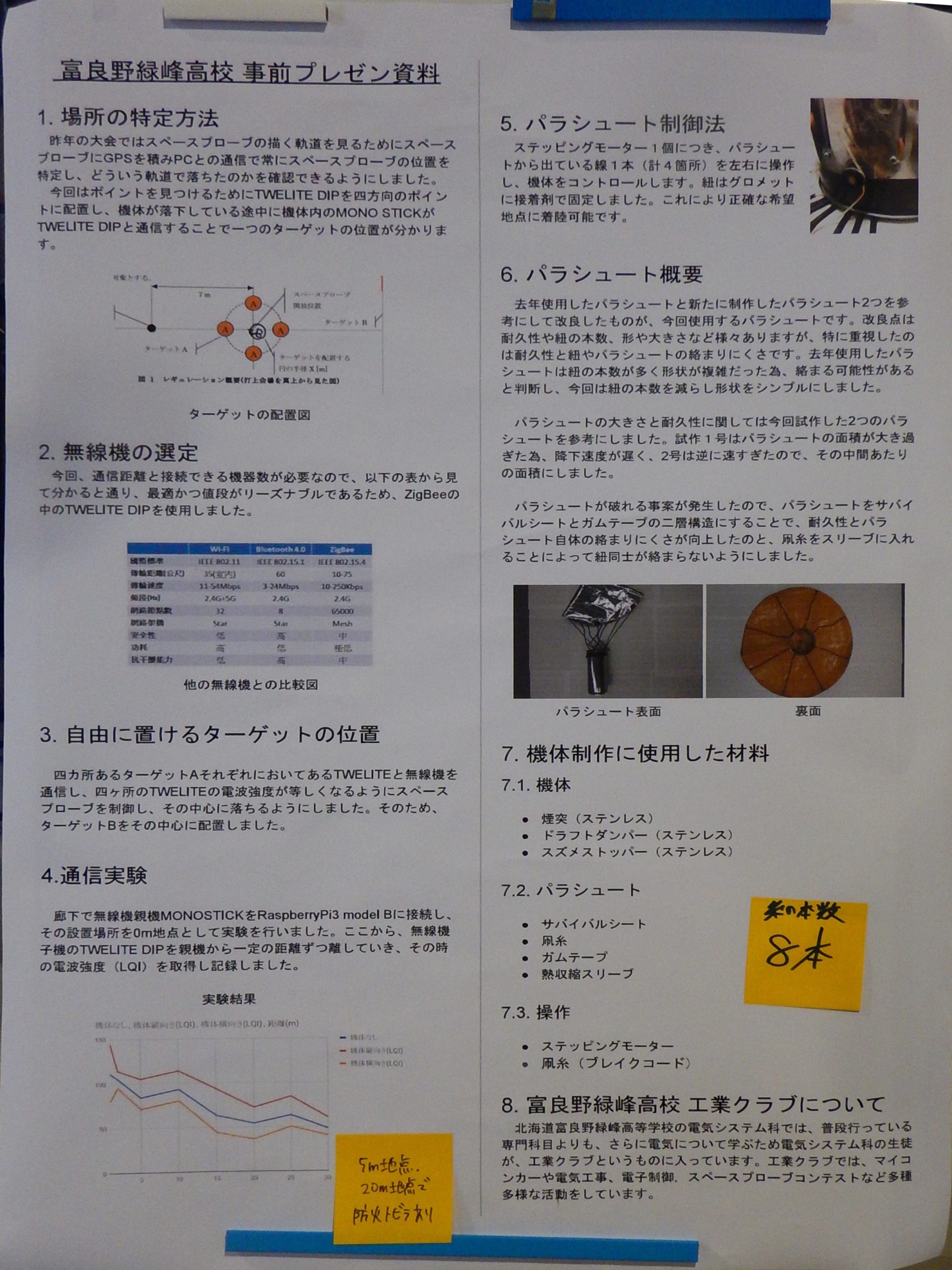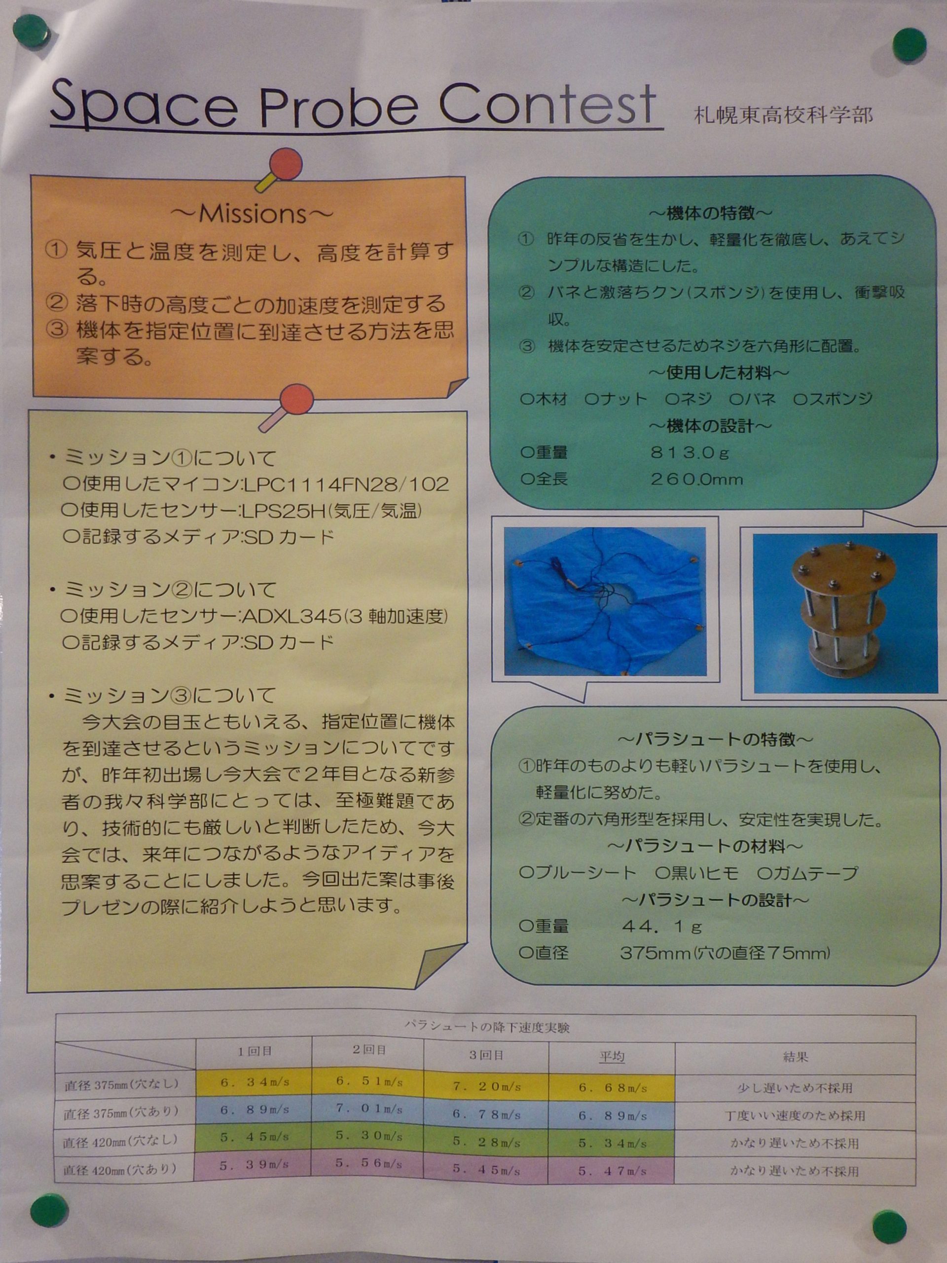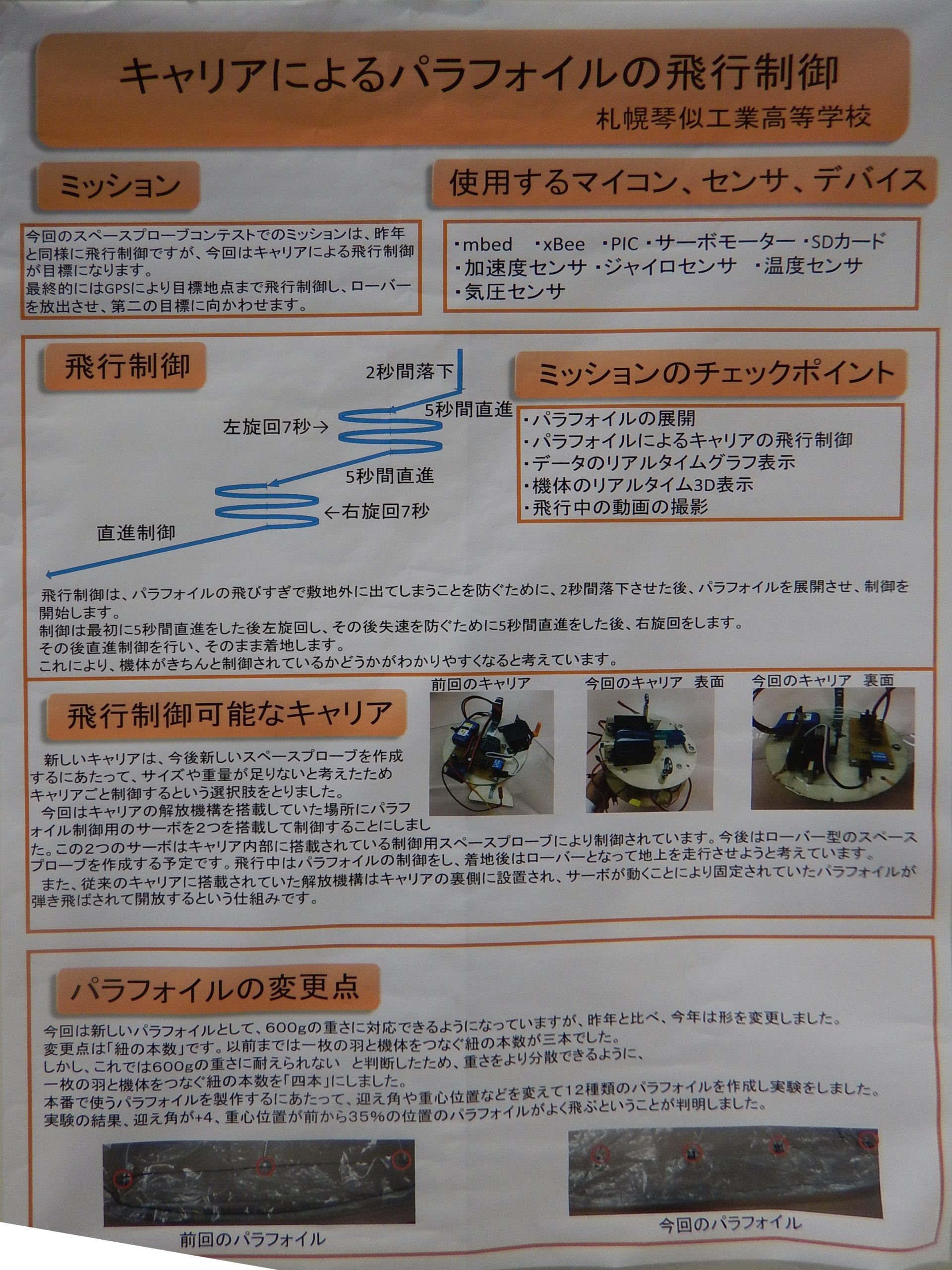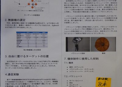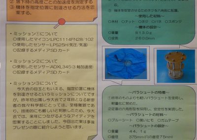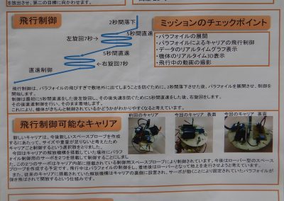 - ターゲットへの飛行制御は、調整不足でうまくいかなかった(直前に地磁気センサのノイズ対策で金属のシールドケース追加し、重量増によるパラシュートサイズの調整などが間に合わなかった)