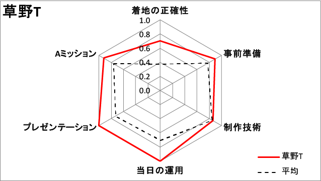 - ターゲットから大きく着地位置がずれ範囲外に着地したので、「着地の正確性」の項目の点数は0